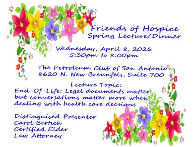Friends of Hospice San Antonio is a 501(c)(3) all-volunteer memberhip organization founded in 1991. We raise funds for uninsured and underinsured hospice patients, and we educate the greater San Antonio community about hospice care.