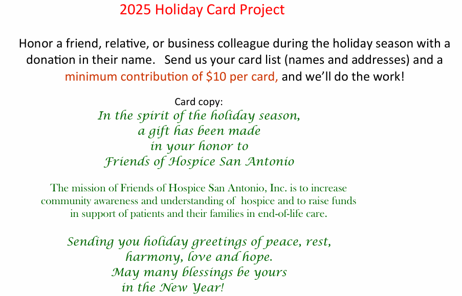 If you’re tired of writing your Christmas cards or are struggling to find time during the hectic holiday season, let the Friends of Hospice San Antonio volunteers write them for you and help you save time. Fill out the form below or download the paper form and mail.
